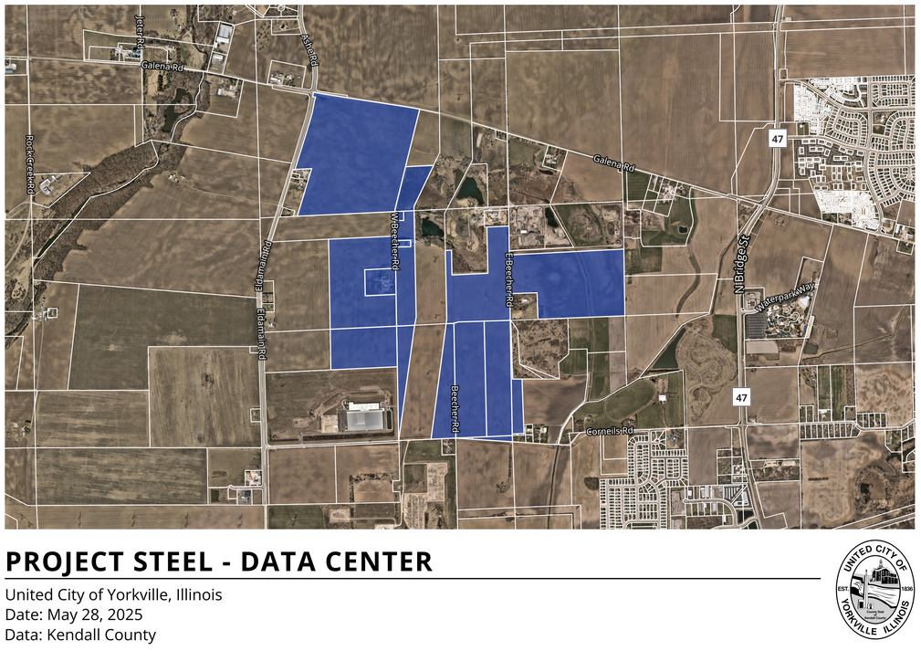 Image: United City of Yorkville. “Project Steel Data Center Campus (Annex Agreement, Rezone, Preliminary PUD & PUD).” United City of Yorkville Official Website, Case No. 2025‑07, https://www.yorkville.il.us/905/Project-Steel-Data-Center-Campus-Annex-A , Accessed March 23, 2026.